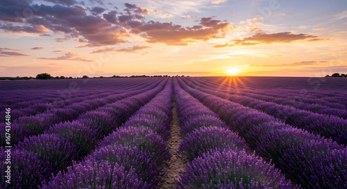 A stunning view of lavender field under the beautiful sunset sky, creating a serene landscape. The scene captures the essence of natural beauty and tranquility.