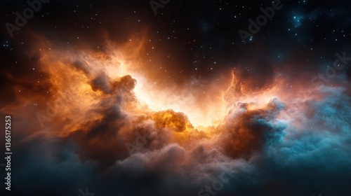 A stunning visualization of vibrant cosmic clouds igniting in a stellar explosion, depicting the beauty and mystery of the universe in brilliant hues of orange and blue.