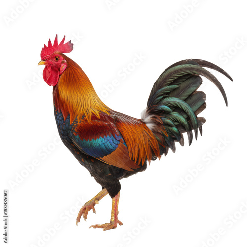 A stunningly vibrant rooster stands alert in profile, showcasing its bright red comb, orange hackles, and iridescent green tail feathers, isolated on a transparent background emphasizing agricultural