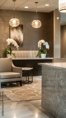 A stylish and welcoming hotel lobby with elegant design, tall ceilings, and modern furnishings like a large front desk, couch, chairs, and potted plants.
