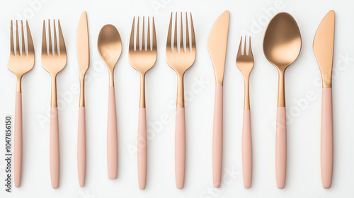 A stylish arrangement of modern cutlery including forks, spoons, and knives with blush pink handles on a white isolated background.