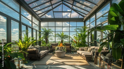 A stylish conservatory filled with tropical plants, comfortable seating, glass walls, and a glass ceiling providing a panoramic view of the sky.