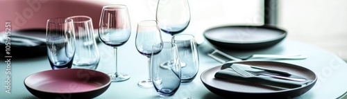 table, dining, glassware, plate, cutlery, setting, meal, modern, elegant, design, colours, arrangement, hospitality, decor, surface, style, atmosphere, cookery, utensil, life events, social, gathering, food, aesthetic, contemporary, round, preparation, celebration, event, lifestyle, comfort, home, chic, simplicity, elegance, visual, presentation, texture, light, shadow, ambience, quality, craft, tableware, fashion, interaction, enjoyment