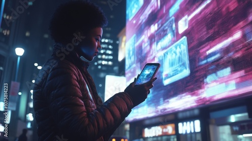 A stylish individual in a futuristic city, using a smartphone