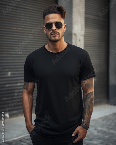 man, model, male, fashion, clothing, t-shirt, black, urban, city, street, pose, posing, sunglasses, photogenic, attractive, cool, casual attire, modern, background, city landscape, stylish, trendy, outfit, style, apparel, look, guy, portrait, lifestyle, minimalist, contemporary, menswear, branding, graphic design