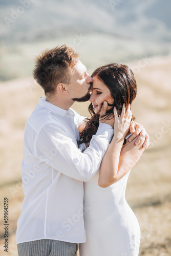 A stylish model couple in the mountains in the summer. A young boy and a girl in a white silk dress are walking on the slope against the background of the forest and mountain peaks. boy kisses a girl