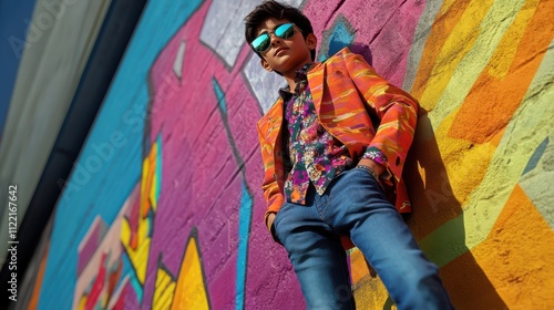 A stylish young boy stands confidently against a vibrant mural. His colorful outfit and cool sunglasses reflect a fun and playful attitude.