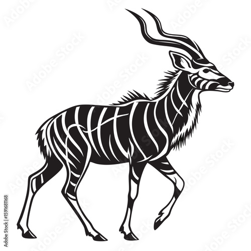 kudu, antelope, animal, wildlife, savanna, africa, mammal, herbivore, striped, horn, curled, graceful, elegant, silhouette, drawing, art, design, graphic, symbol, nature, creature, zoo, safari, game, park, reserve, bush