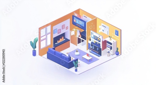 A stylized illustration of a cozy living room with modern furniture and decor.