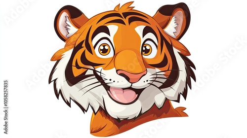 A stylized tiger head with bright, detailed orange fur and thick black stripes, smiling against a plain white background in a vector format.