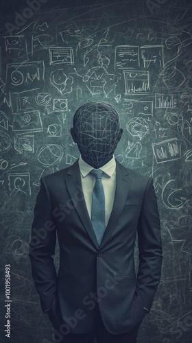 A suited figure with a geometric head stands against a chalkboard filled with symbols and graphs.