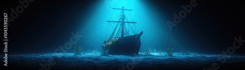 A sunken ship illuminated by underwater light, surrounded by marine life, evoking mystery and adventure.