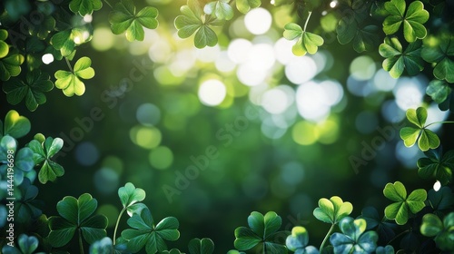 A sunlit backdrop of lush green four-leaf clovers with a bokeh effect forming a beautiful frame around a bright out-of-focus central area many nature lovers adore