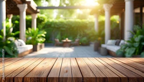 A sunlit outdoor patio with wooden table in foreground, blurred background.