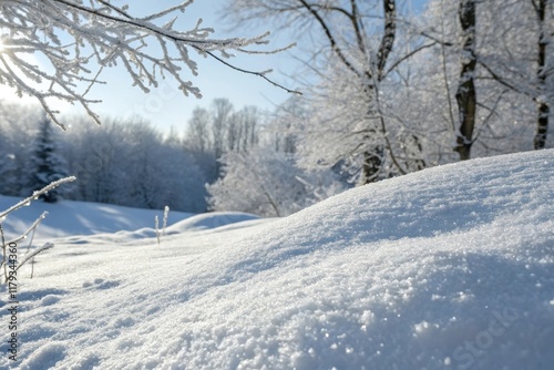 A sunlit winter landscape showcasing a pristine snowdrift, adorned with frost-covered branches in the foreground and a background of snow-laden trees under a bright blue sky.