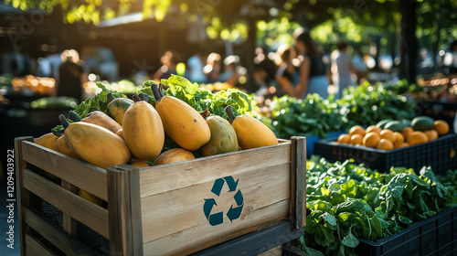 A sunny market scene featuring ripe papayas in a wooden box marked with a recycling symbol, surrounded by fresh greens and other seasonal fruits