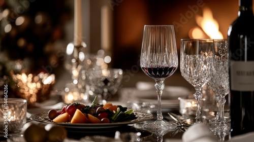 A table set for an elegant dinner with red wine, sparkling water, and a fruit platter.