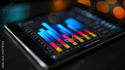 bar, graph, tablet, colourful, screen, sharpened, bar chart, device, vibrant, multiple, vertical, different, category, datum, point, variety, colours, red, blue, yellow, orange, dark, surface, blurred, background, light, night time, indoor, setting, primary, striking, visual, element, blurred background