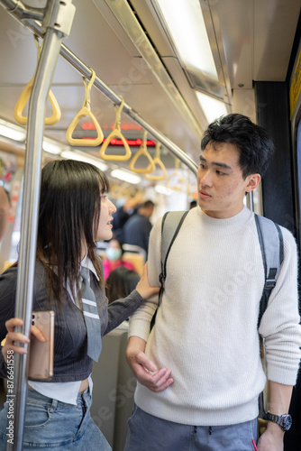 taiwanese, woman, 20s, hong kong, man, couple, riding, subway, taipei, city, chatting, using, smartphone, together, happy, relaxed, urban, casual attire, cheerful, youthful, smiling, engaging, modern, dynamic, partnership, affectionate, observing, culture, atmosphere, public, transportation, commute, connection, technology, interactive, blithe, vibrant, journey, conversation