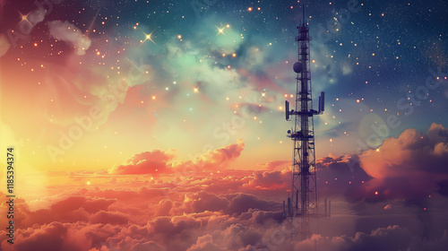 cloud, twilight, sky, celestial, tower, broadcasting, signal, antennae, cosmic, star, atmosphere, gloaming, technology, dreamy, cloudscape, sunset, transmission, high altitude, dramatic sky, satellite, space, telecom, scenic, futuristic, wonder, aethereal, starlight, horizon, astronomy, galaxy, altitude, innovation, solitude, dusk, mystic, elevation, awe, skyward, dreamlike, engineering, television