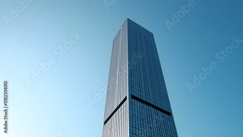 A tall glass skyscraper reaches up to the sky, showcasing modern architecture and reflecting sunlight against a clear blue backdrop