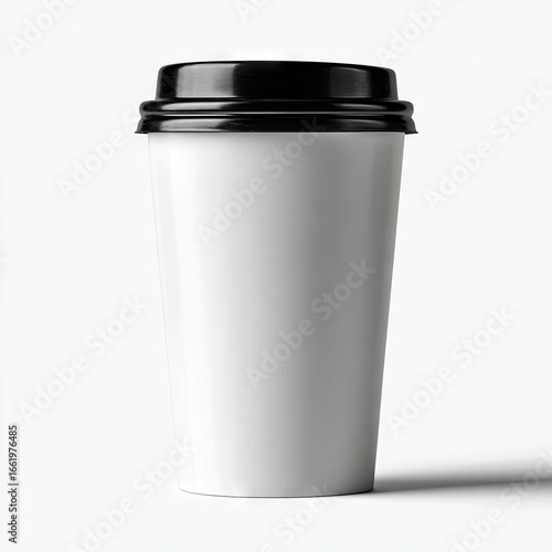 A tall, white disposable paper coffee cup with a black, flat lid casts a subtle shadow on a white background