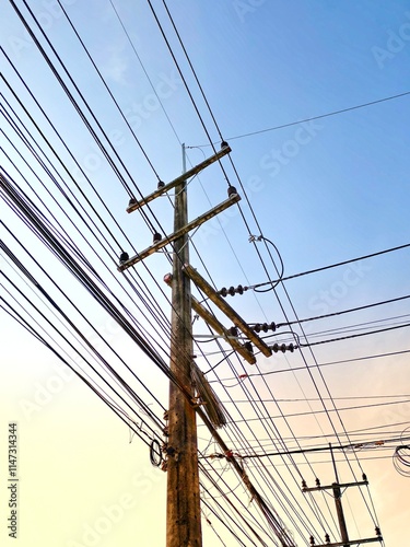 A Tangled Web of Power: A wooden utility pole stands tall against a vibrant sky, crisscrossed with a network of power lines, symbolizing the intricate infrastructure that powers our modern world.