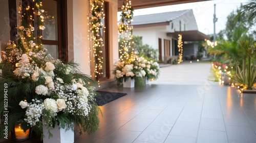 elegant, entrance, floral, arrangement, light, inviting, atmosphere, design, guest, elegance, style, beauty, welcoming, contemporary, modern, doorway, porch, greenery, bloom, fitting, grandeur, decor, twinkle, illumination, stylish, cosy, luxurious, refined, charme, delight, serenity, magical, romantic, hospitality, adornment, ambience, decoration, cheerful, chic, glorious, sophistication