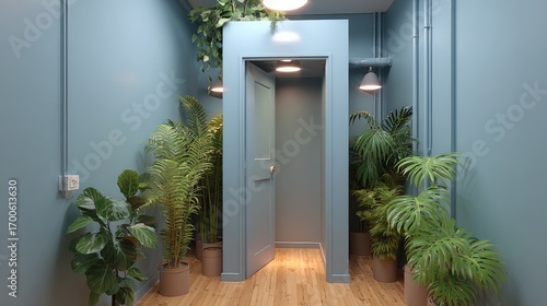 hallway, teal, plant, potted, doorway, open, interior, design, room, light, green, tropical, lush, natural, cosy, warm, minimalist, modern, wooden, floor, calm, peaceful, hidden, foliage, indoor, garden, space, decor, door, simple, muted, soft, nature, fresh, contemporary, art, three-dimensional, render, rendering, scene, potting, botanical