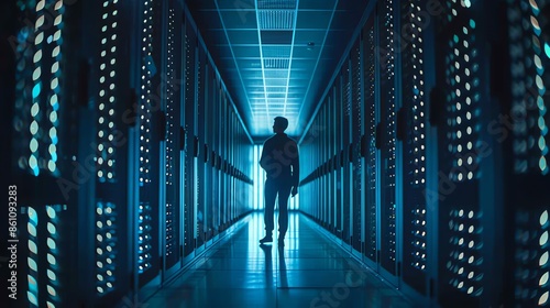A tech professional servicing, maintenance, of server in a data center, rack server, security, networking, server room, security, website, monitoring