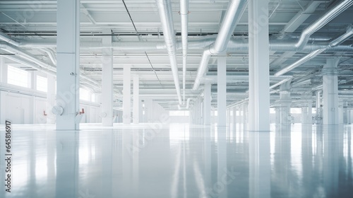 A technical room filled with white pipes. Pipeline inside modern factory. Illustration for banner, poster, cover, brochure, advertising, marketing or presentation.