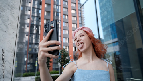 A teenage girl poses for a selfie on her smartphone. She shows her pierced tongue to her friends