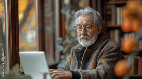 A telephoto angle photo of an older man participating in an online class via his laptop, fully engaged in the learning process, with copy space