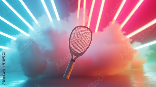 A tennis racket is suspended in the air above a cloud of smoke