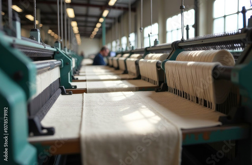 A textile factory buzzes with activity as workers operate weaving machines to produce fabric during daylight hours
