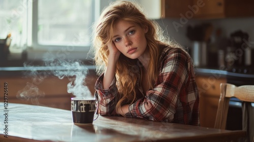 woman, girl, redhead, mug, hot drink, steam, thoughtful, pensive, contemplative, kitchen, table, plaid, shirt, indoor, home, natural light, freckle, portrait, model, beautiful, attractive, young, adult, long hair, casual attire, relaxed, calm, serene, cosy, comfort, warm, morning, day, domestic, lifestyle, interior, photo, image, pic, photo