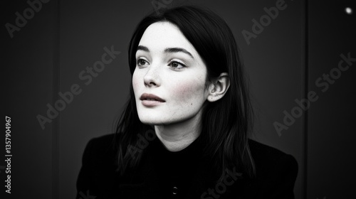 woman, young, gaze, expression, beauty, portrait, black, white, thoughtful, serene, elegant, minimalist, feature, natural, calm, style, fashion, model, face, hair, emotion, look, skin, eye, lip, soft, profile, artistic, photo, creative, design, copy space, space, copy, calmness, contemplation, elegance, charme, simplicity, aesthetic, visual, inspiration