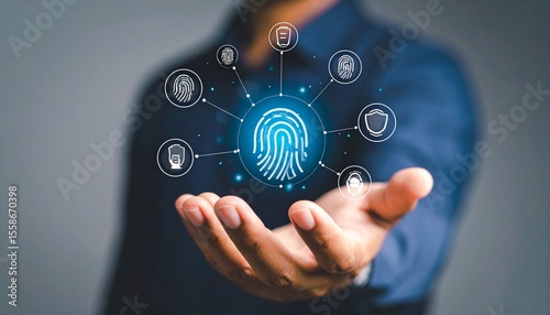 A three-dimensional icon in the shape of a fingerprint floating above a man's hand