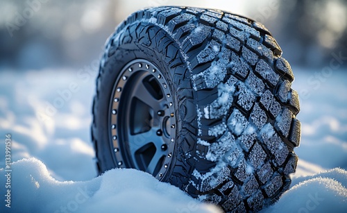 A tire on fluffy snow against a vibrant blue background; ideal for winter promotions, automotive ads, or seasonal campaigns.