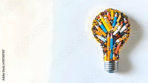 A top view of a light bulb made with pencils, erasers and paperclips on a clean white surface, symbolizing creativity and innovation