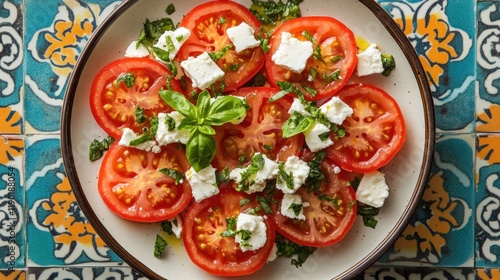 A top-down view of a plate of sliced red tomatoes, feta cheese crumbles, and fresh herbs, placed on a colorful tile surface with vibrant patterns.