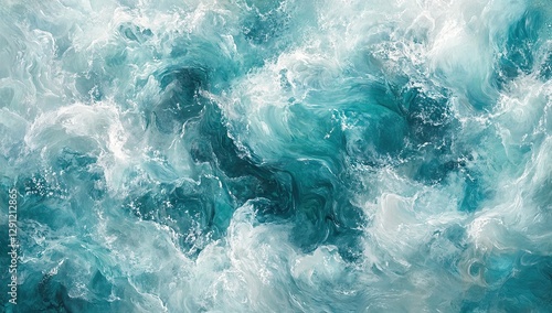 A top-down view of the ocean's surface, with waves crashing against each other in shades of turquoise