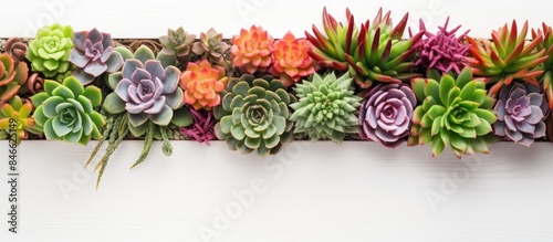 A top-view photo of assorted succulents arranged on a white wooden desk, perfect as a stylish interior background with copy space image.