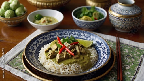 A traditional Thai meal setup with spicy green curry, jasmine rice, and a side of fresh vegetables, beautifully presented on ceramic dishes with ornate patterns