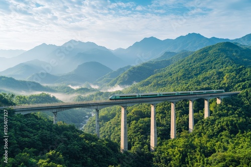 A train gracefully moves across a high elevated bridge, with misty skies and expansive mountain views, epitomizing the blend of human progress and nature's greatness.
