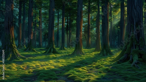 A tranquil forest scene at dusk, with tall, ancient trees casting long shadows on a carpet of vibrant green moss, and a soft, warm light filtering through the dense foliage.