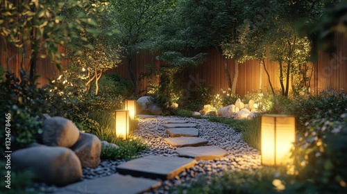 garden, path, paseo, stone, pebble, lamp, lighting, nature, tree, plant, foliage, leaf, green, grass, landscape, design, wood, fence, wall, backyard, evening, twilight, dusk, serenity, calm, peaceful, zen, tranquil, artistic, aesthetic, soft, warm, glow, illumination, fixture, pathway, rock, boulder, small, gravel, texture, environment, scenery, exterior, detail
