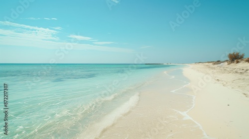 beach, water, sand, sky, wave, tranquil, serene, bright, soft, ocean, sea, calmness, relaxation, nature, beauty, vacation, travel, summer, coastal, paradise, shoreline, horizon, scenic, peaceful, isolation, untouched, unspoiled, idylli, tropical, casual attire, smooth, minimalistic, simple, contemporary, picturesque, clean, natural, open, freedom, joy