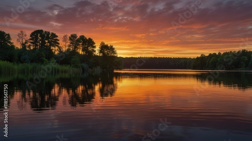 "A tranquil lake surrounded by trees, with the sun setting on the horizon. The water is perfectly still, reflecting the vivid colors of the sunset and the silhouettes of nearby vegetation. The scene e