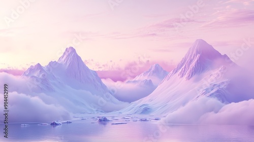 A tranquil mountain landscape with soft pink and purple hues, fluffy clouds in the sky, and shimmering waters below, creating a peaceful atmosphere ideal for relaxation and reflection